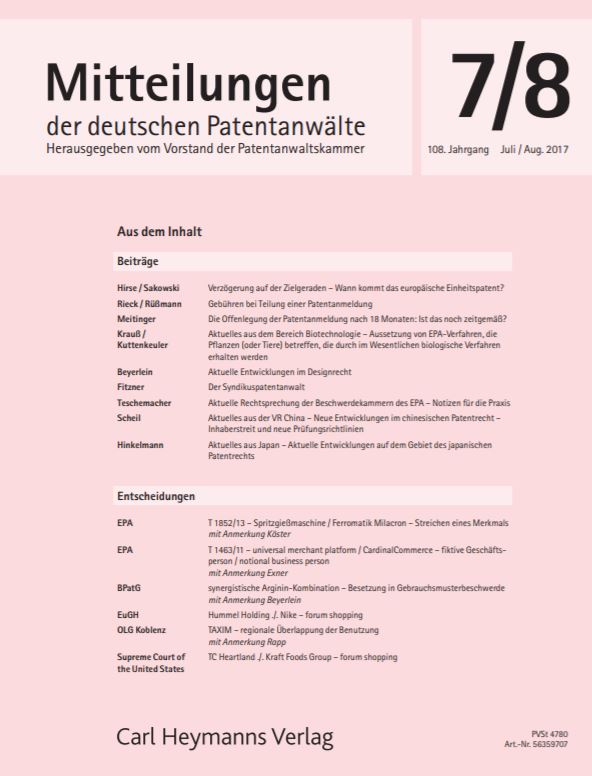 Dieser Artikel befasst sich in der Juli/August-Ausgabe des Jahres 2017 mit der zeitlichen Verzögerung der Veröffentlichung einer beim Patentamt eingereichten Patentanmeldung um 18 Monate.