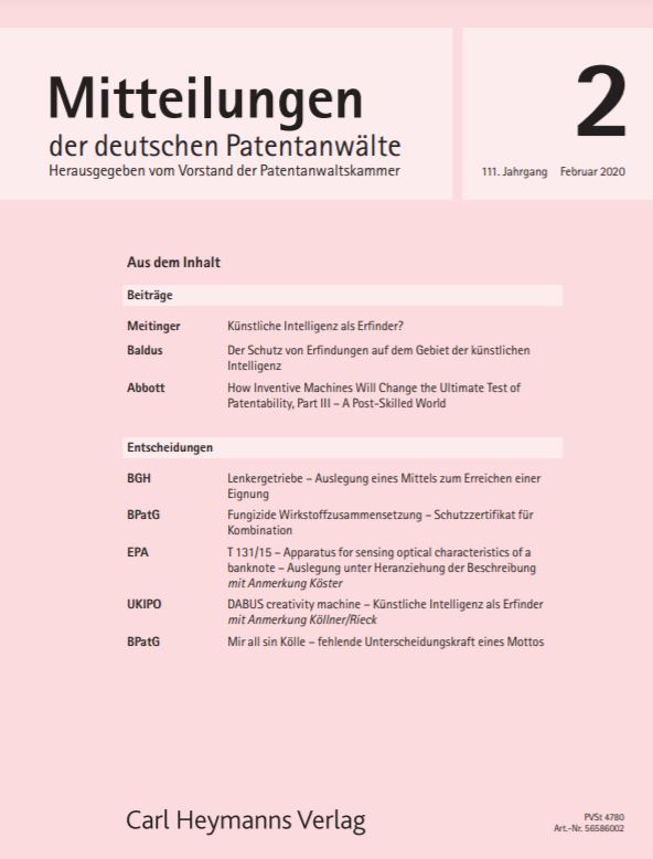 Dr. Meitinger beschreibt in der Februar-Ausgabe des Jahres 2020 die Konsequenzen des Auftretens der Künstlichen Intelligenz für das Patentrecht