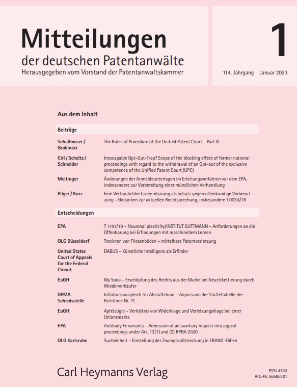 Dr. Meitinger beschreibt in der Januar-Ausgabe des Jahres 2023 die Möglichkeiten, Änderungen an den Anmeldeunterlagen im Erteilungsverfahren vor dem Europäischen Patentamt, insbesondere zur Vorbereitung einer mündlichen Verhandlung, vorzunehmen.