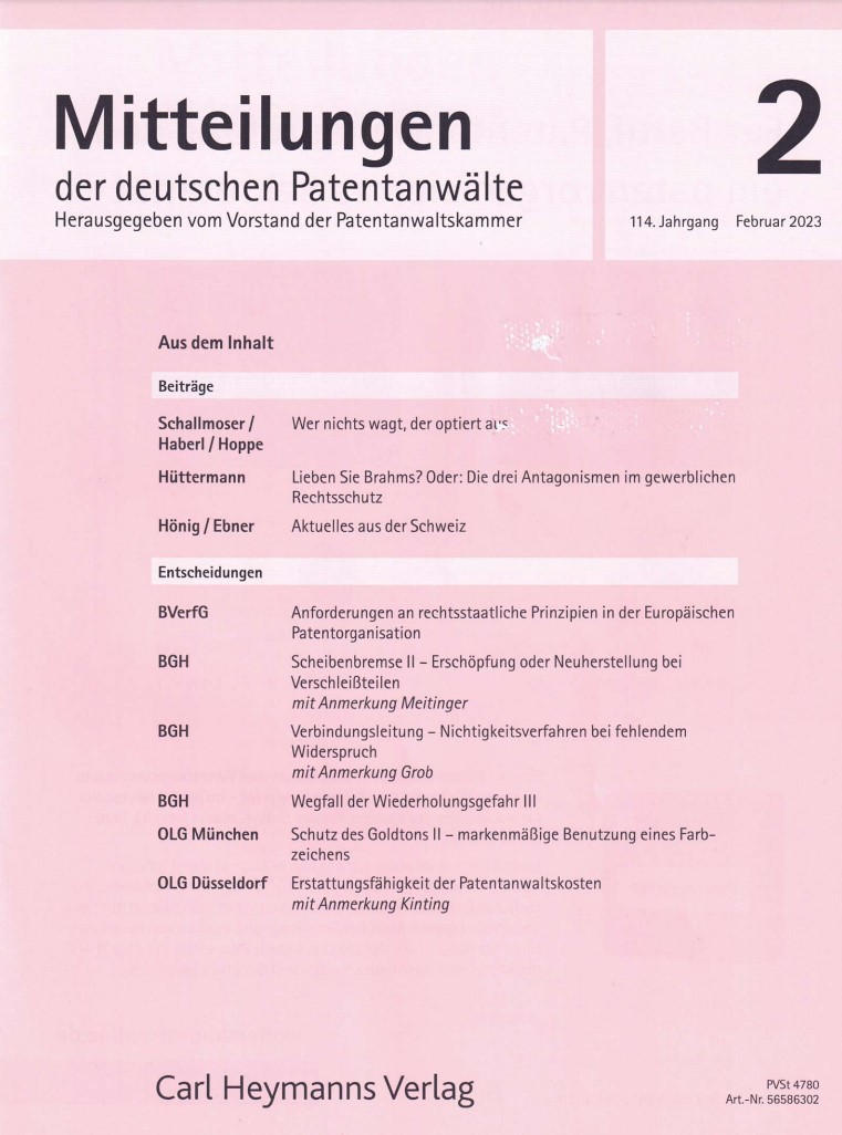 Dr. Meitinger bespricht in der Februar-Ausgabe des Jahres 2023 die BGH-Entscheidung "Scheibenbremse II", bei der es um eine angebliche mittelbare Patentverletzung durch ein Verschleißteil ging.